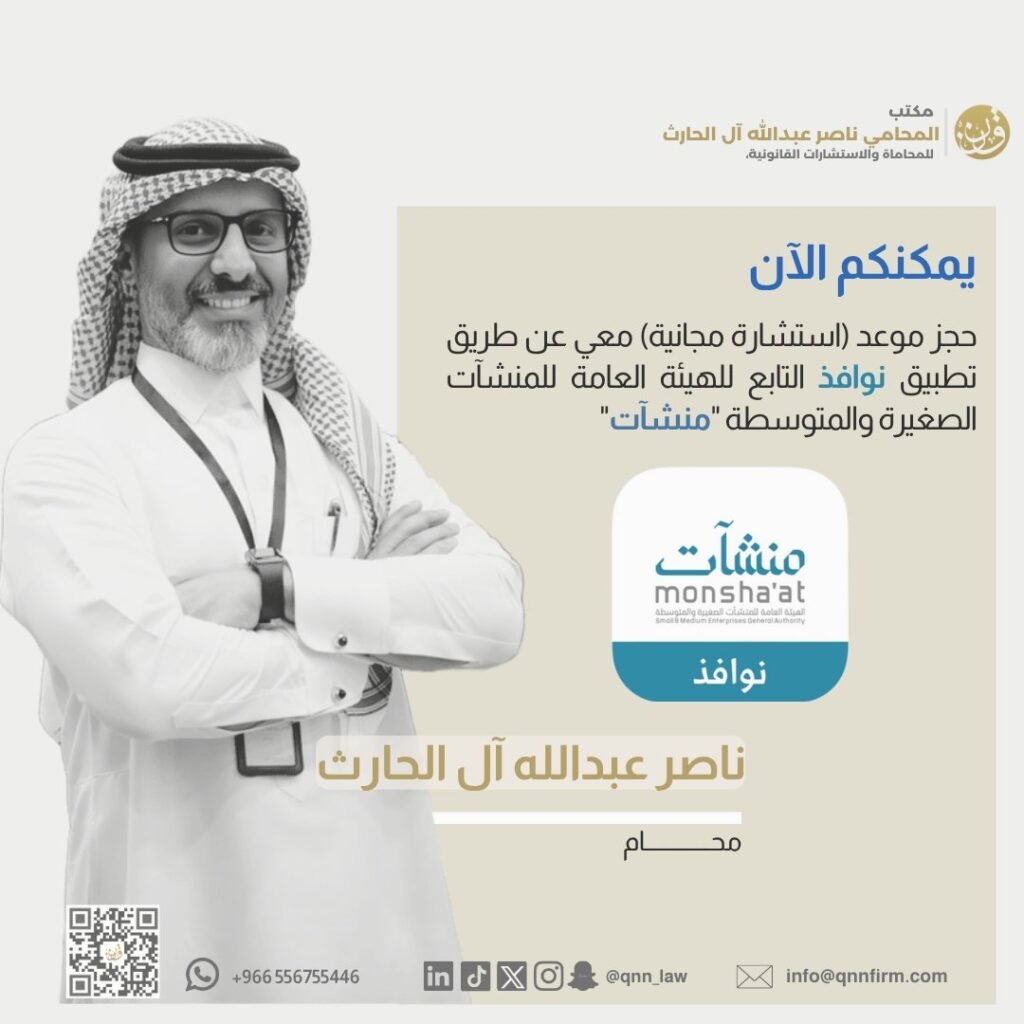 اعتماد المحامي/ ناصر آل الحارث كمستشار قانوني في تطبيق نوافذ الخاص بالهيئة العامة للمنشآت الصغيرة والمتوسطة (منشآت) وندعوكم للاستفادة من خدمة (الاستشارات القانونية المجانية) علمًا بأن الجلسات: – حضوريه، تقدم في مركز دعم المنشآت في الخبر – عن بعد، تقدم عبر تطبيق نوافذ